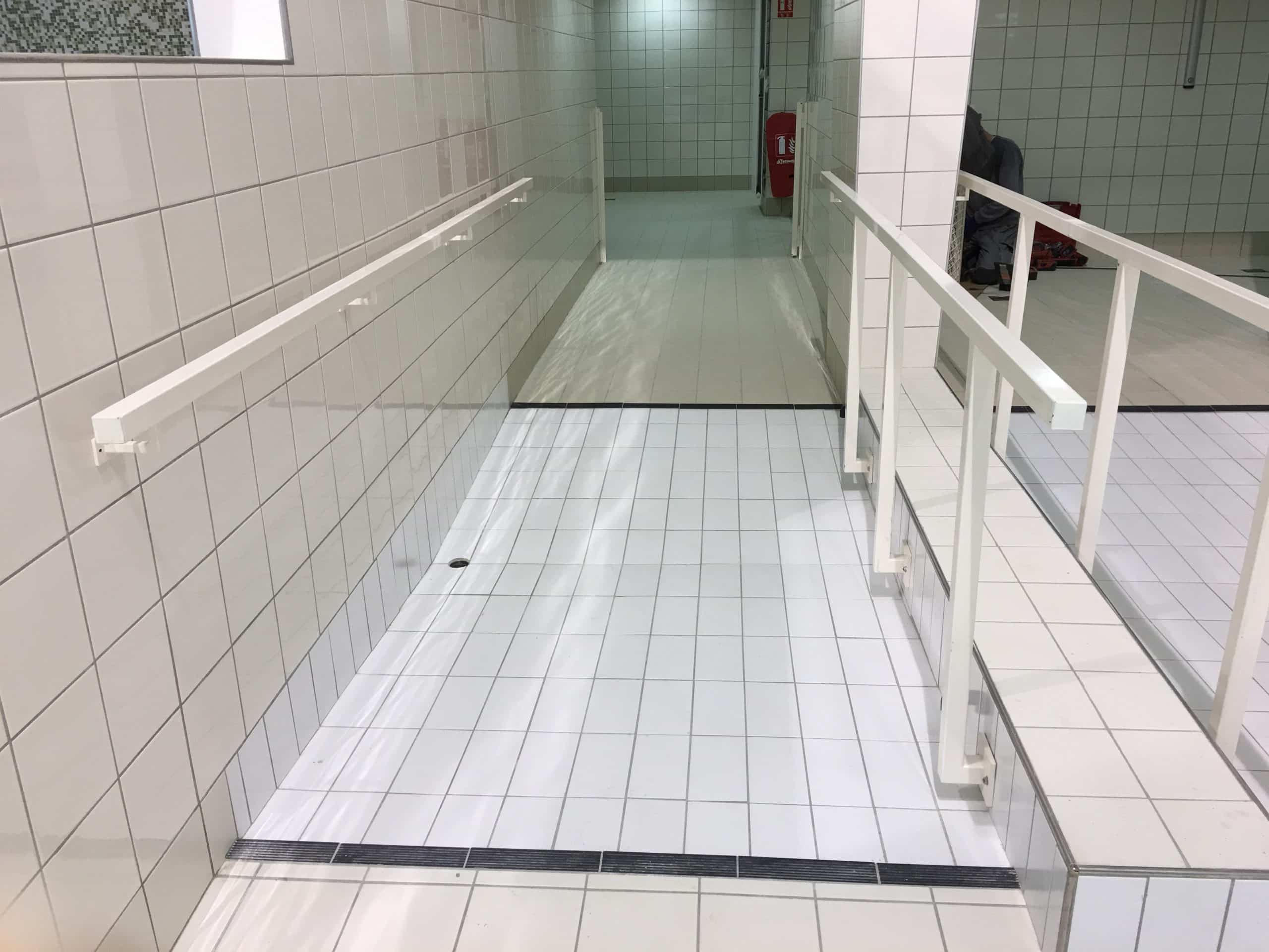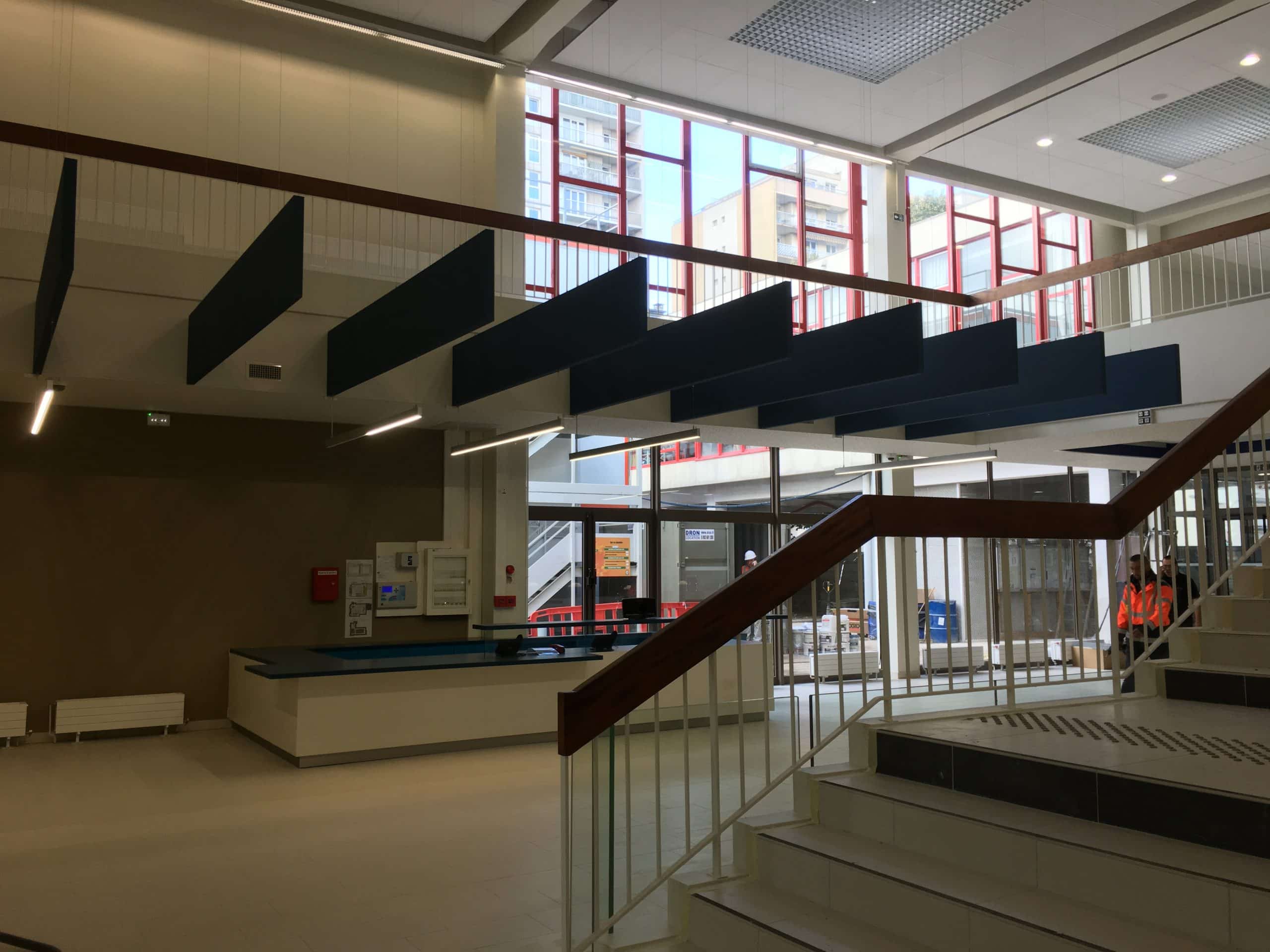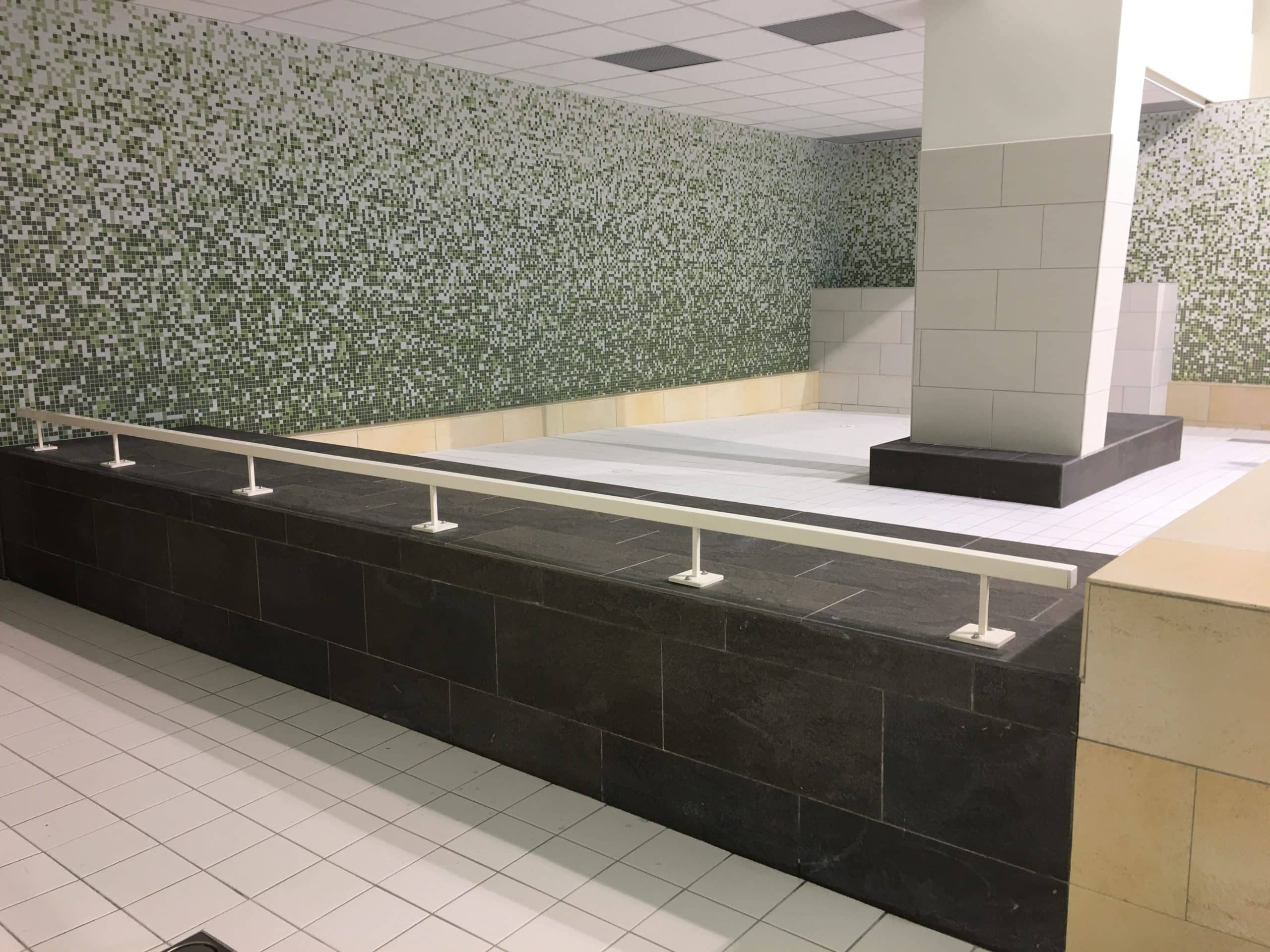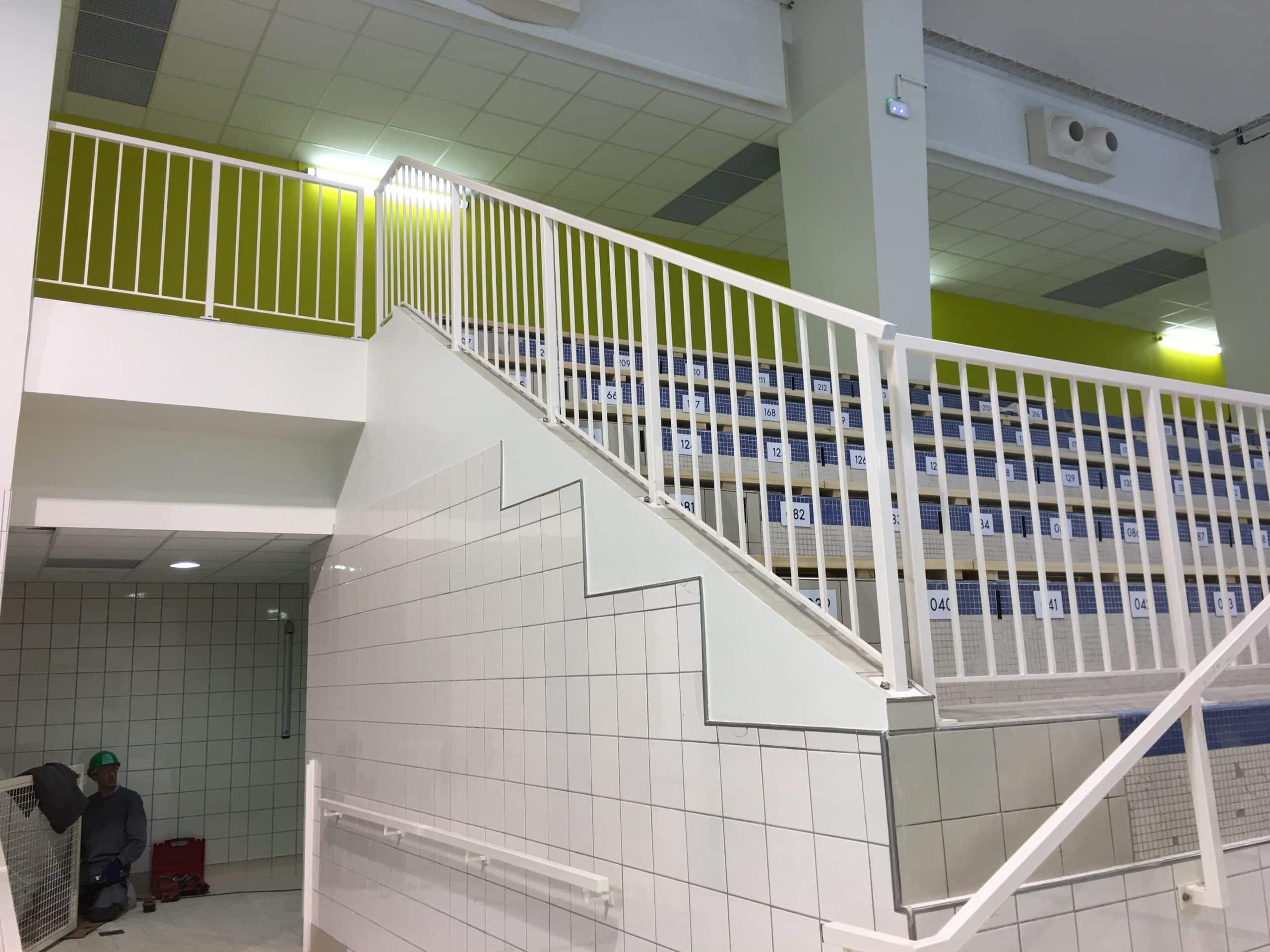 Réalisation à la piscine de Rosny par A.B.E.L : fabrication et pose sur mesure de garde-corps, mains-courantes et ouvrages métalliques.